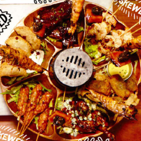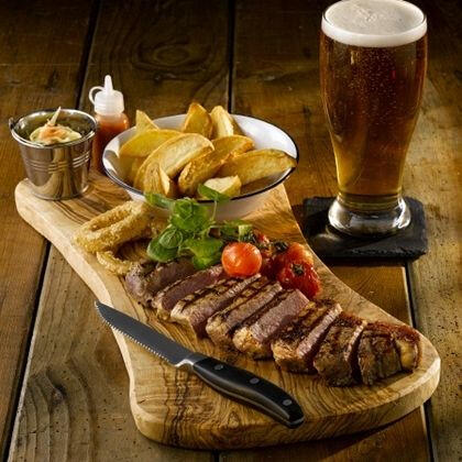 An assortment of various meats on a platter, rare-to-well-done steaks, sizzling bacon, deep-fried onion rings, roasted prosciutto, as well as a garnish of smaller, fresh vegetables such as cherry tomatoes, green salads, diced paprika and slaw, topped off with some cream crispy chips and a zesty tartar sauce. Perfect for a night out with your mates.