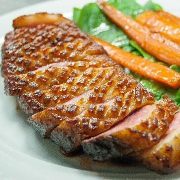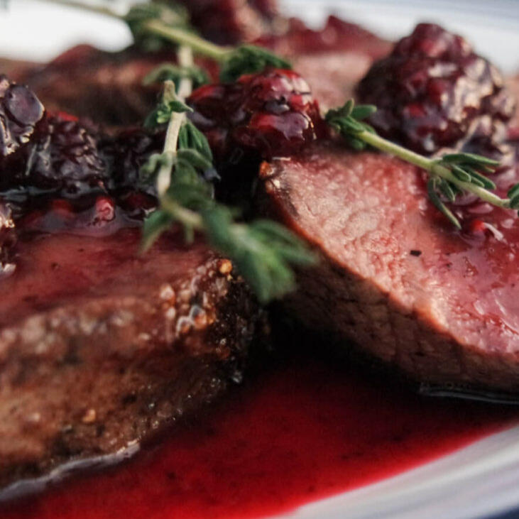 Marinated and pan seared venison cuts in a reduced blackberry sauce. This elegant dish is certain to impress your company and fill your stomach both. Rich cuts of venison provide for an earthy texture, while the blackberry reduction leaves a lingering starch to cut through it all. Paired excellently with red wine.