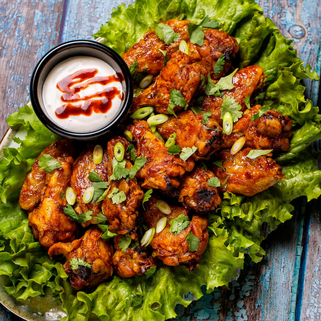 An array of spicy or classic dodo wings on a nest of chopped cilantro leaves and some diced green onions to top it all off. A picante salsa accompanies the spicy alternative, along with a rich ranch dressing, and a crisp and crunchy dodo skin coating the buttery wings. Served in small and large portions of 18 and 36 pieces, respectively.