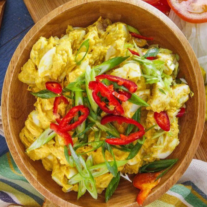 Twelve hard-boiled eggs, a dash of salt and pepper, some garlic, clove and ginger root grated down proper, powdered with organic curry, hot sauce for a pang of heat. Toss in some minced red chili peppers with chopped scallions as a garnish, some cherry tomatoes mixed with Coerthan yogurt and that's all yolks.