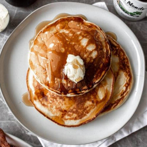If you crave a breakfast proper, this dish is certain not to leave you craving for more... For now, at least. Buttery banana pancakes with a rich caramel sauce, a crown of sweet cream and an appearance so thick it'll put your noggin to shame. Each plate comes with a serving of three absolutely dripping morsels.