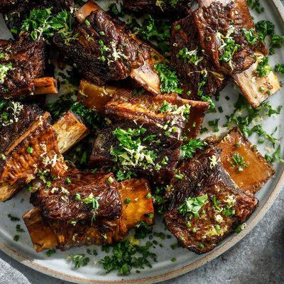 Glistening, garlic braised short ribs with roasted and seasoned fall veggies and a dash of red wine make for the perfect hands-on eating experience. Celery, onions, carrots, thyme, optionally parsley, some chives and a generous portion of lemon zest balance out the succulent meat with a flavourful bounty of vegetables.