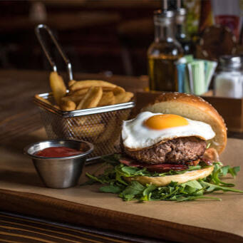 Crispy, bronze fries, spicy or mild ketchup on request, a fresh, earthy salad, two sunny buns decked with sesame seeds, a few chops of paprika, a few rings of tomatoes, an absolutely burly patty unit and a still-sizzling crown of sunny-side up egg on top of it all. The sliders come in a pack of two or four burgers, so order responsibly.
